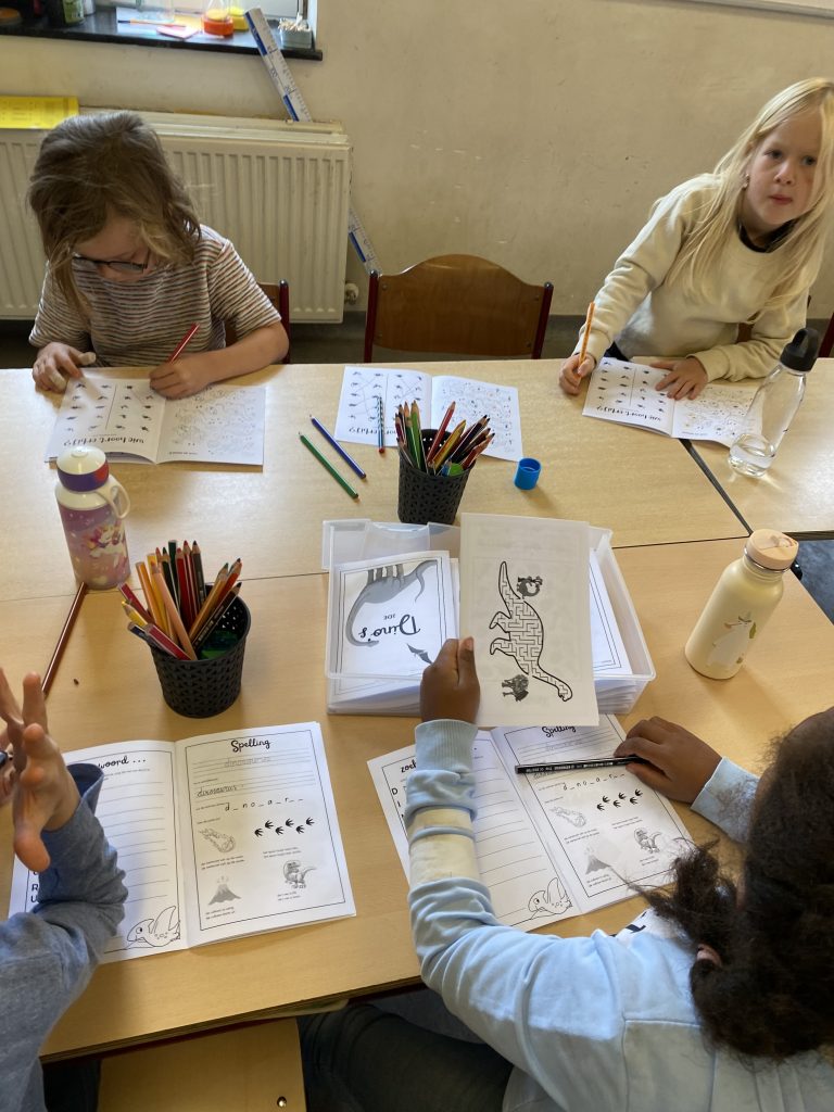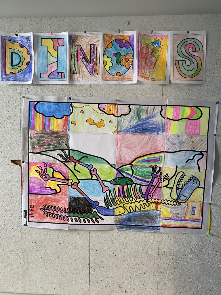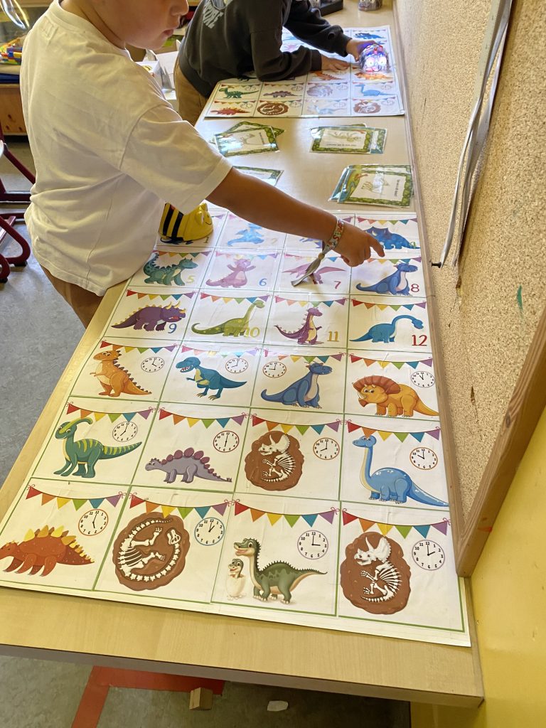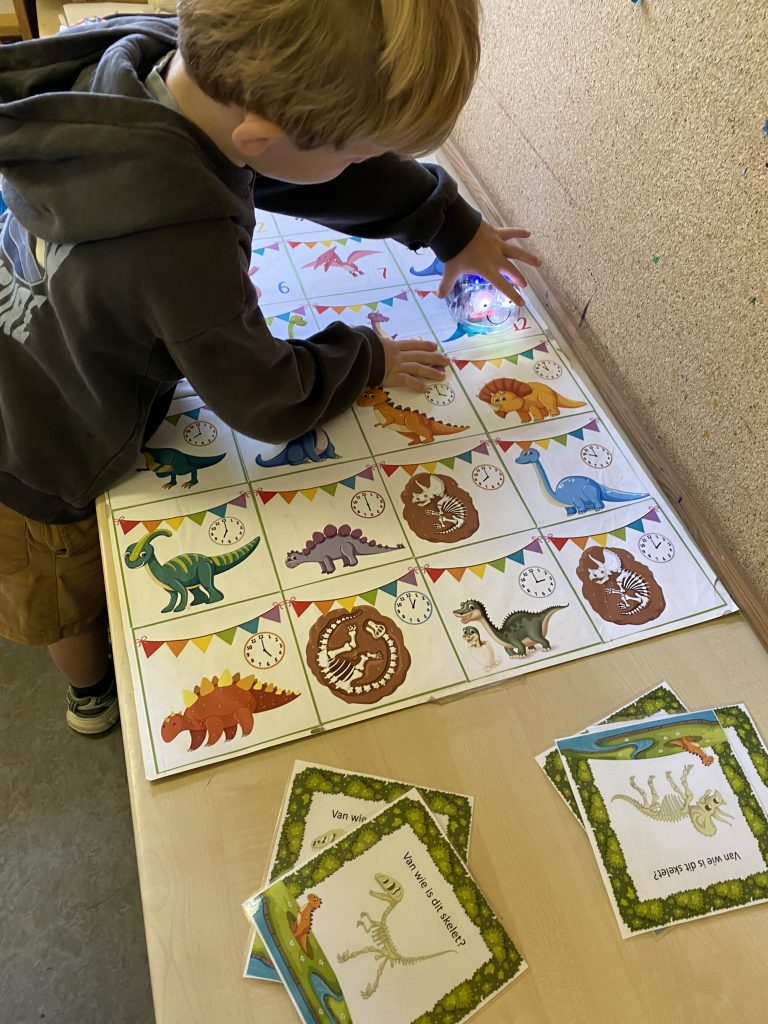 Deze week stond dan ook de ochtendwerktijd al in teken van dinosaurussen: stappenplan teken, kleien, beebots met dino’s, een rekenopdracht met logisch denken, … waren onze moetjes, de magjes waren een schimmenspel, getallentekeningen, spelletjes met dino’s, de dinobibliotheek.